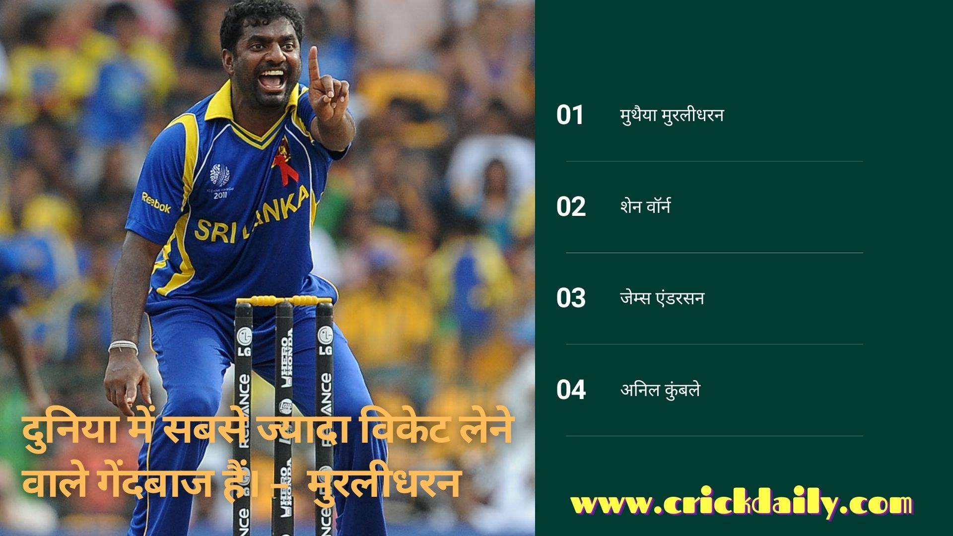 श्रीलंका के स्पिनर गेंदबाज मुरलीधरन ने अपने टेस्ट क्रिकेट करियर में 800 विकेट लिए हैं और दुनिया में सबसे ज्यादा विकेट लेने वाले गेंदबाज हैं। शेन वॉर्न दूसरे नंबर पर ऑस्ट्रेलियाई खिलाड़ी हैं, उन्होंने अपने पूरे टेस्ट क्रिकेट करियर में 708 विकेट लिए हैं. जेम्स एंडरसन अभी भी क्रिकेट खेल रहे हैं और अब वह दुनिया के टॉप 10 गेंदबाज में शामिल हैं, उन्होंने टेस्ट क्रिकेट में 632 विकेट लिए हैं और आगे भी नए रिकॉर्ड बनाएंगे। चौथे नंबर पर अनिल कुंबले हैं जिन्होंने अपने टेस्ट क्रिकेट करियर में 619 विकेट लिए हैं।