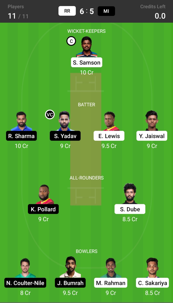 RR vs MI Deram11 Team | आरआर बनाम एमआई ड्रीम11 टीम